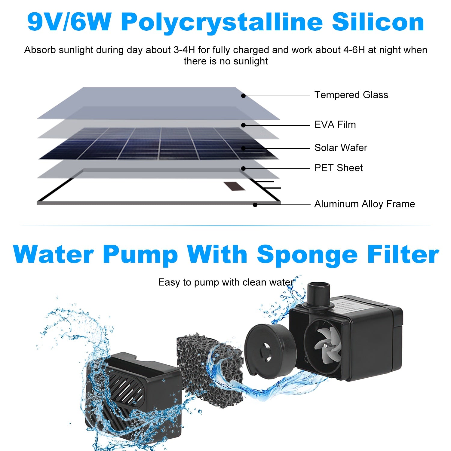 *Extended Operation with Rechargeable Battery*:Equipped with a 2200mAh built-in battery,this solar water feature stores energy during the day to provide 4-6 hours of continuous operation after just 3-4 hours of charging. Enjoy consistent water flow even during brief cloudy periods.