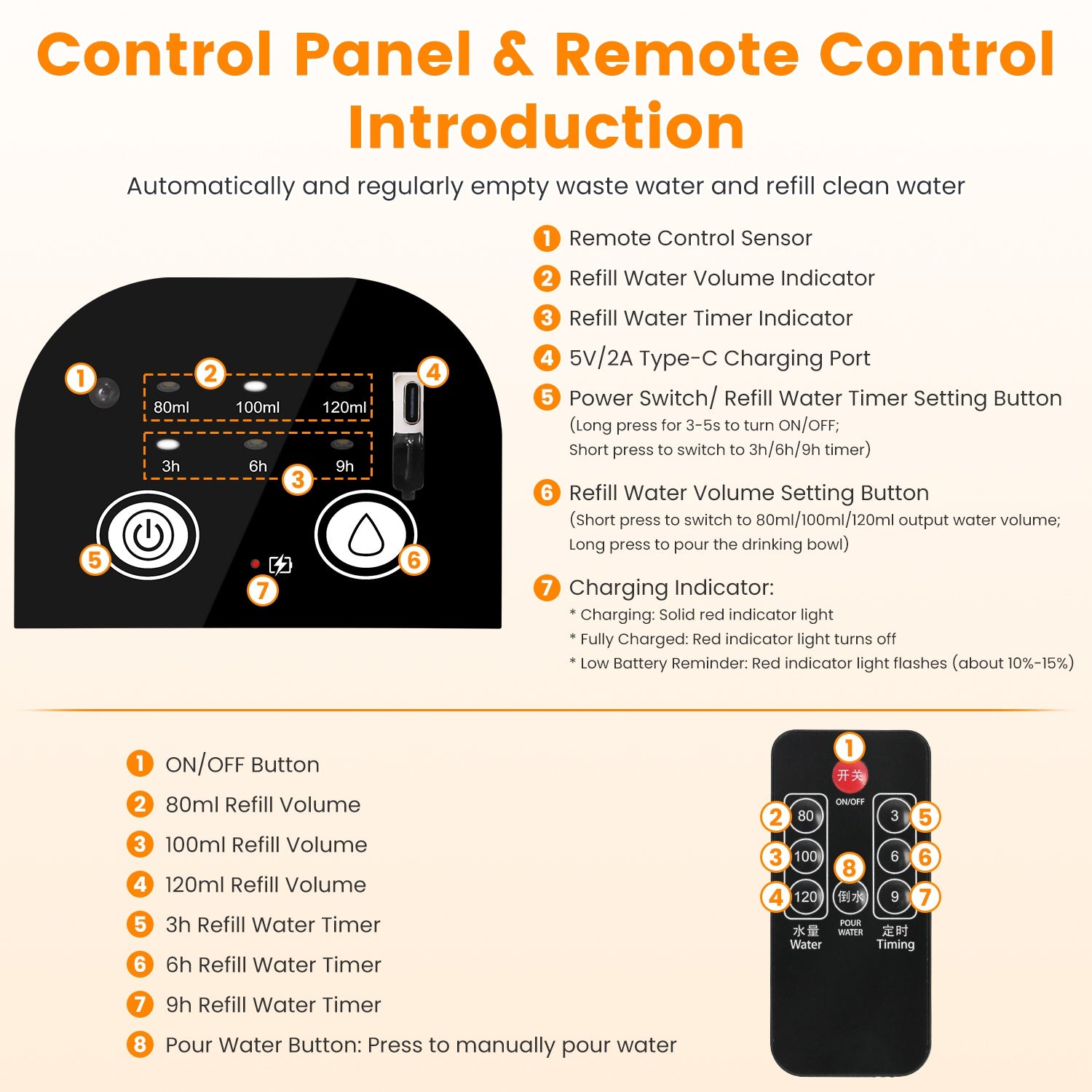 *User-Friendly Operation*:Featuring simple button controls,this water station activates with a 3-5 second press and hold of the power button. The intuitive interface allows easy water volume and refill timing adjustments through icon buttons,complemented by convenient remote control access for effortless settings management. The bottom designed with 8Pcs silicone pads to keep the device stable and prevent slipping.